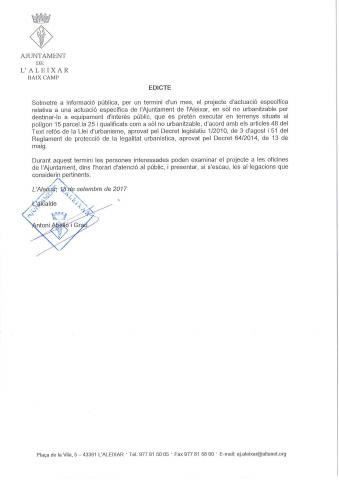 El Departament de Cultura de la Generalitat de Catalunya ha atorgat a l’Ajuntament de l’Aleixar la subvenció “Redacció de Projectes d’Obra d’Equipaments Culturals de Titularitat Municipal” , amb un finançament de 6,992,44€. Aquests ajuts tenen com a objectiu finançar la redacció del projecte bàsic...
