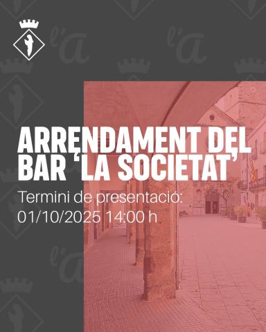 Obert el termini per a l’arrendament del bar “La Societat”. S'ha publicat la convocatòria per a l’arrendament del bar situat a l’espai de “La Societat”. Les persones interessades poden presentar les seves ofertes fins a l’1 d’octubre de 2025 a les 14.00 h. Trobareu tota la informació detallada a l'...