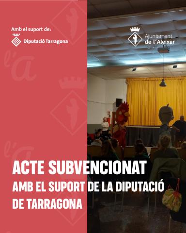 Gràcies al suport econòmic de la Diputació de Tarragona, l’Ajuntament de l’Aleixar ha pogut finançar actes culturals, com el següent: Actuació del grup Els Passerells Teatre-Estudi, el dia 01/03/2026, en motiu de la Festa d'homenatge a la Gent de Gran de l'Aleixar. Amb del suport de la Diputació de...