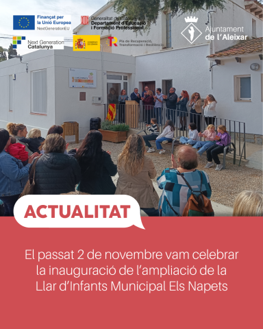 El passat 2 de novembre de 2025 a les 12.30 h va tenir lloc la inauguració de l'ampliació de la Llar d’Infants Municipal Els Napets, un projecte pensat per oferir als més petits un entorn proper, educatiu i ple de vida. L’acte, conduït per la regidora d’Educació, Mariona Solà, va comptar amb les...