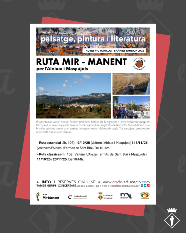 Aquest octubre i novembre torna una experiència cultural única que ens convida a descobrir els paisatges de l’Aleixar i Maspujols que van inspirar el pintor Joaquim Mir i l’escriptor Marià Manent. Passeja pels espais que van marcar la història de l’art i la literatura del nostre territori. - Ruta...