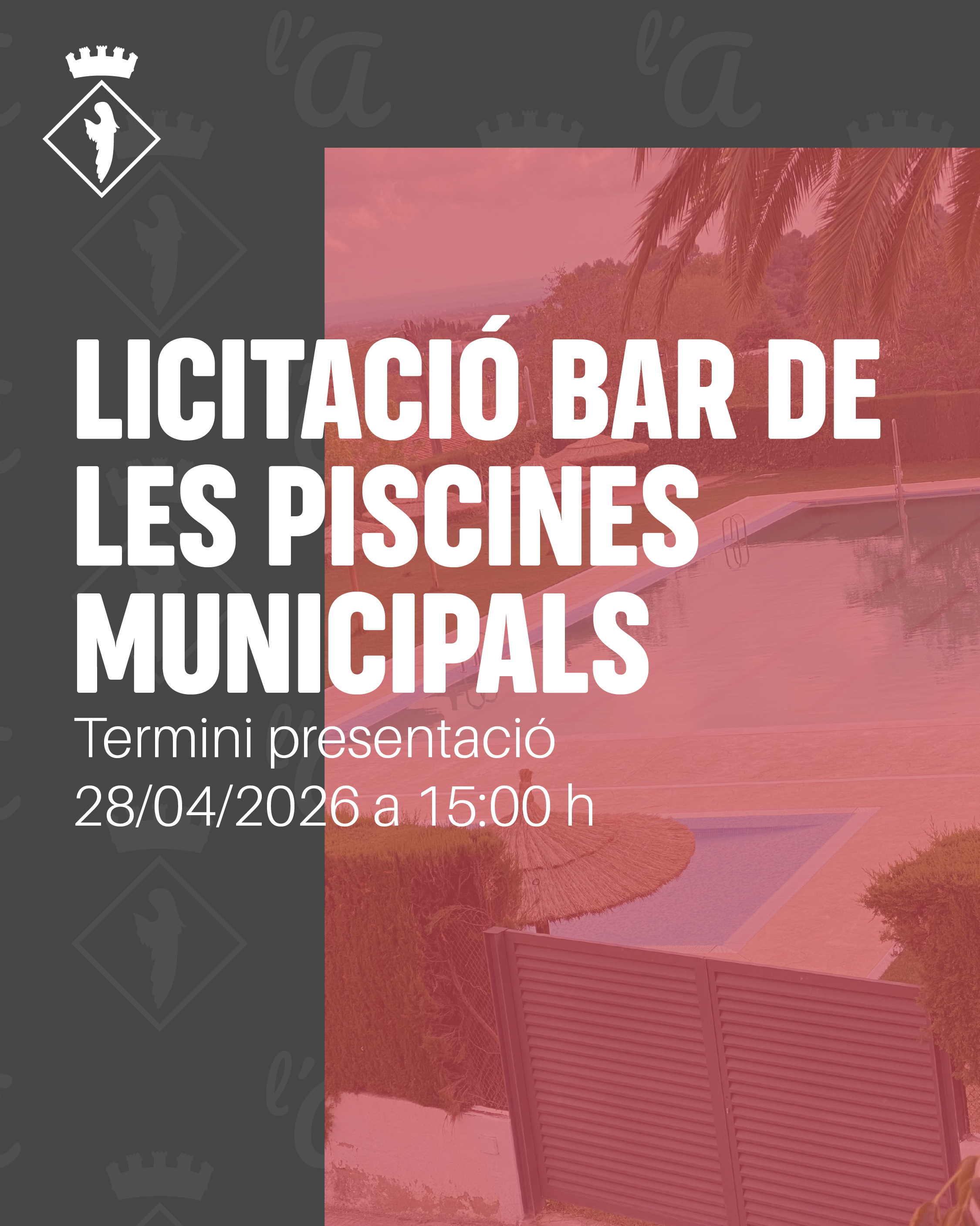 L’Ajuntament de l’Aleixar anuncia l’inici del procés de licitació per a l’atorgament de la llicència d’ús privatiu del bar de les Piscines Municipals, de titularitat municipal.